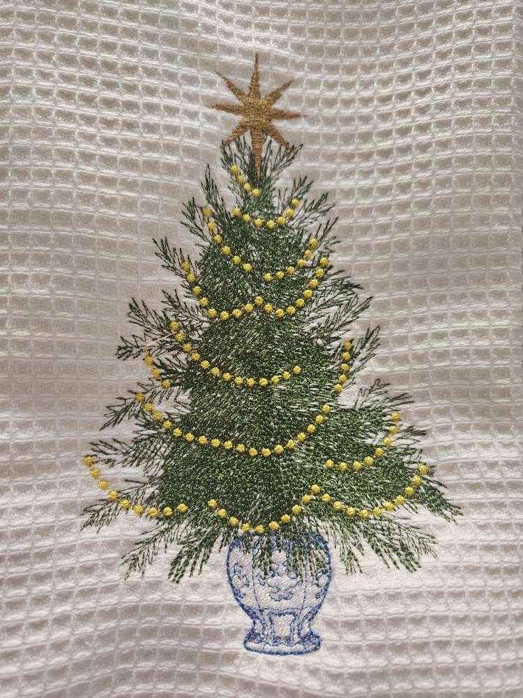 Vintage old fashioned Chinoiseries garland Christmas tree with star ornament machine embroidery designs in assorted sizes 4, 5, 6, 7, 8 inches