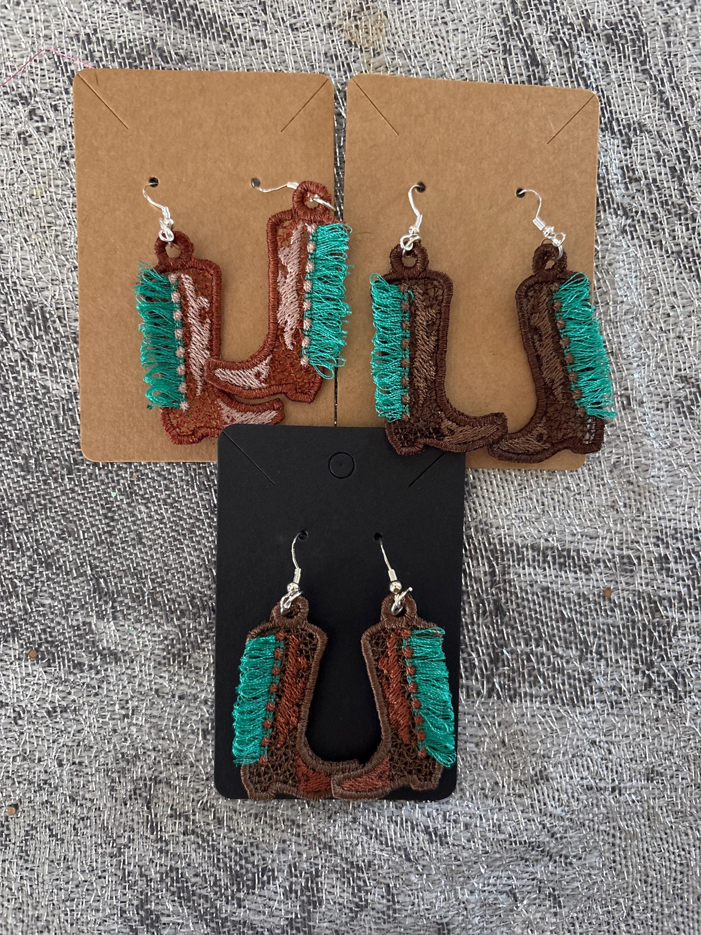 ✨ Stitch up some Western charm with the Cowboy Cowgirl Fringed Fluffy Boots and Hat Earrings & Charm Pendant embroidery design. This freestanding lace design is perfect for creating lightweight, stylish earrings, keychains, or bag charms with a fun fringed effect.