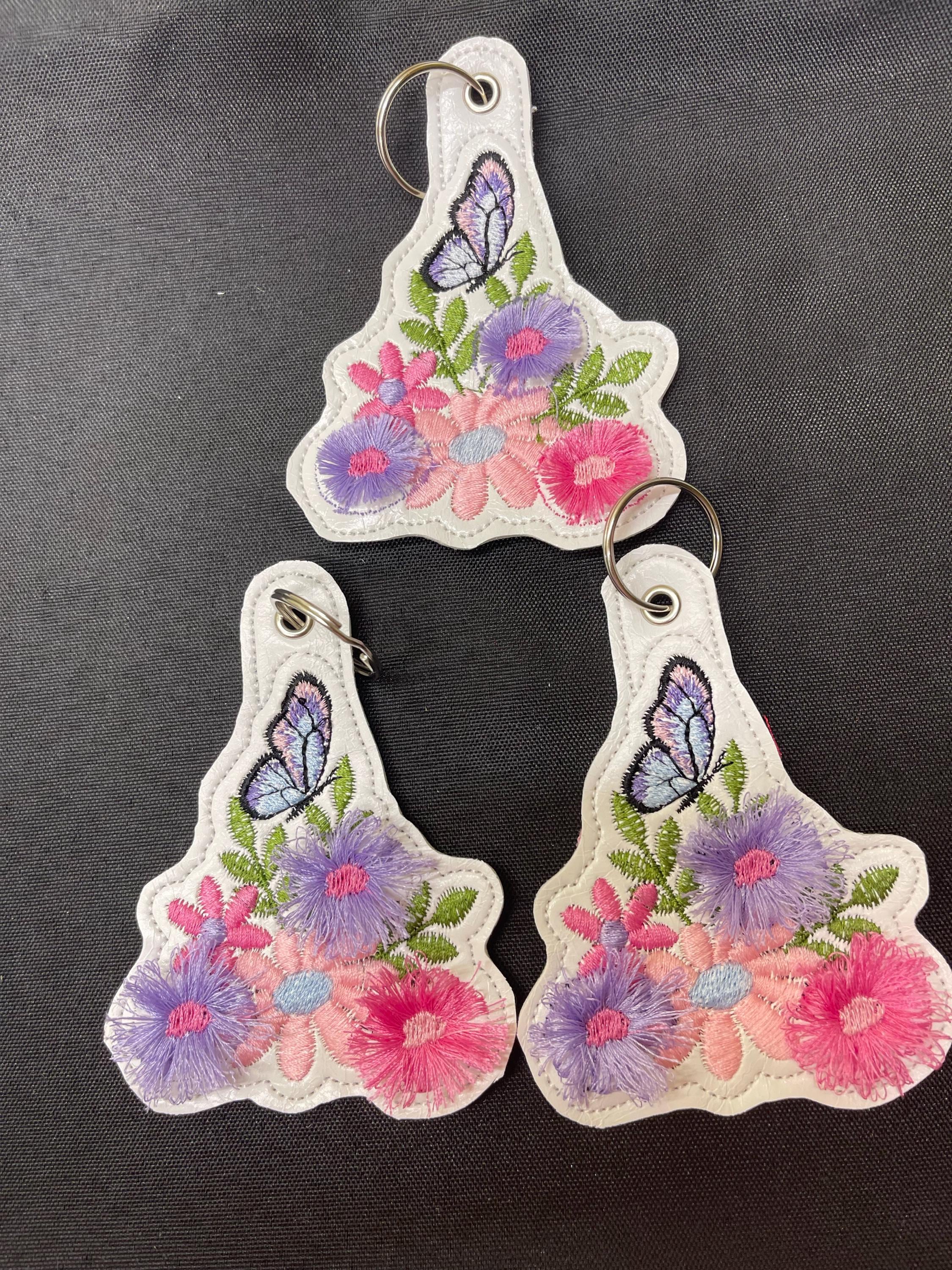 Floral Flower Garden and Butterfly Eyelet and Key Fob Snap Tab fringed fluffy flowered keychain in the hoop ITH machine embroidery designs
