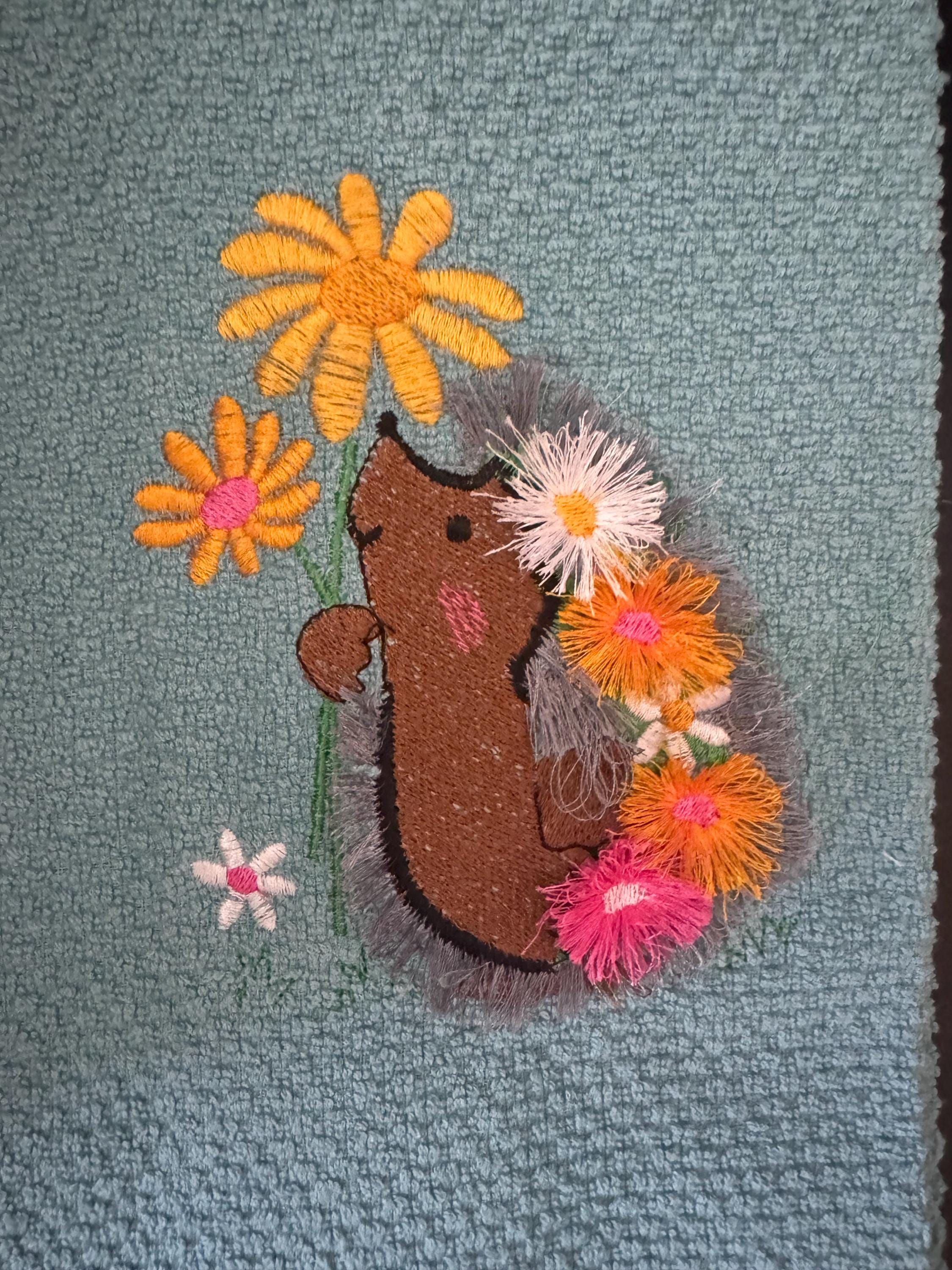 Cute Fringed Fluffy Hedgehog with flower stem Floral Fringe machine embroidery designs kids girls t-shirt fuzzy design sizes 4 up to 6 inch