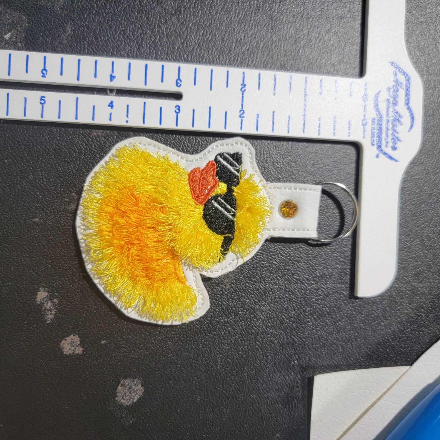 Fringed Rubber Duck Sun Glasses Eyelet and Key Fob Snap Tab in the hoop machine embroidery designs ITH project fluffy bath duck kids bag tag